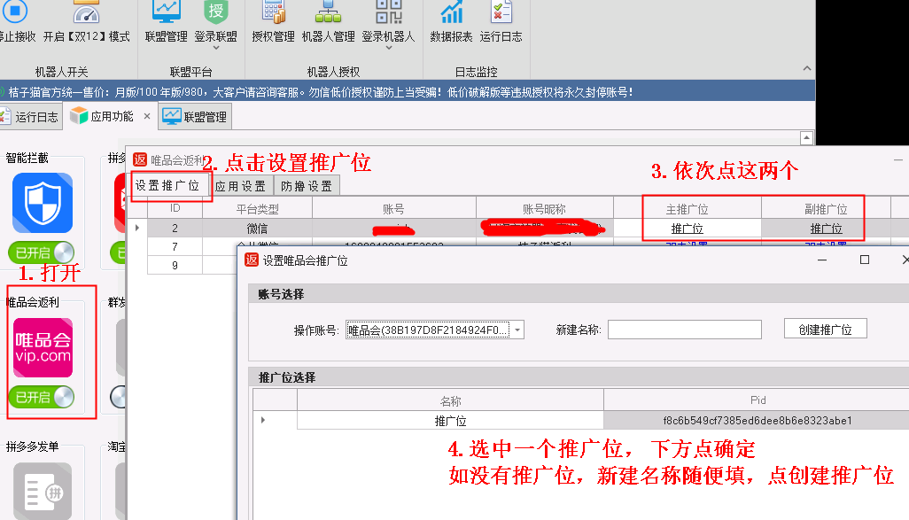 3.打开唯品会返利插件,设置主副推广位(主副都必须设置,否则无法查券)