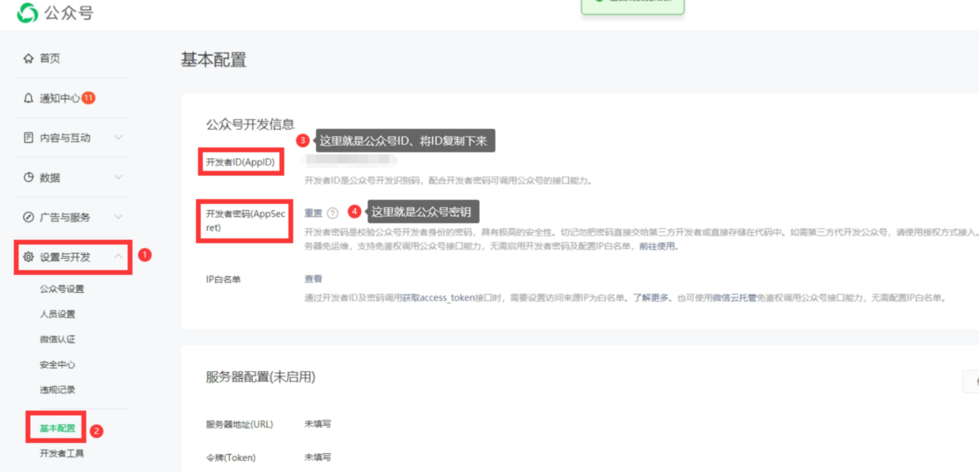 【获取路径】:登录公众号后台、找到“设置与开发”-“基本设置”、(查看截图标记处)